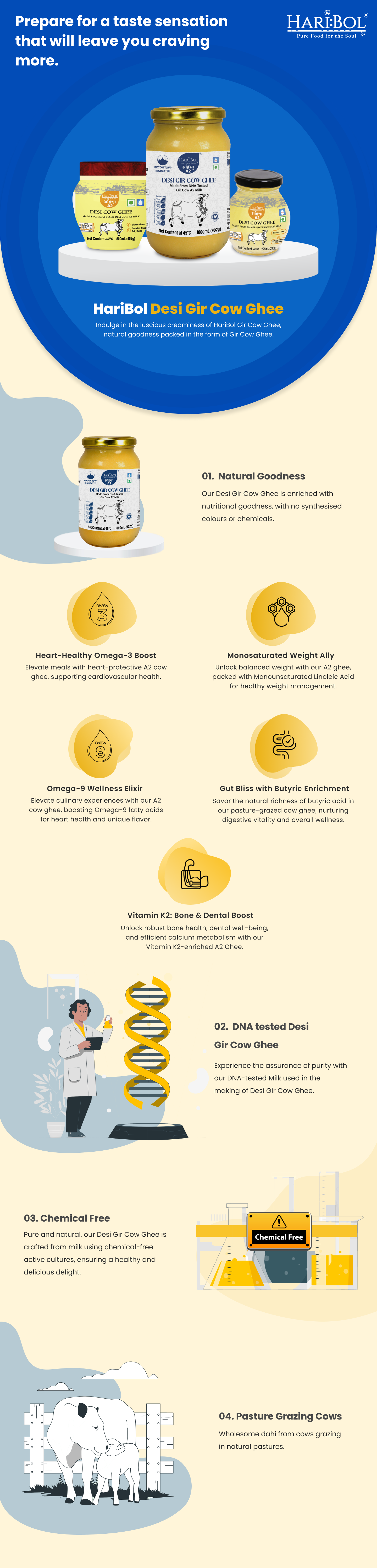 Quality Assurance: Every batch of HariBol's Desi Gir Cow Ghee undergoes stringent testing for purity, ensuring it remains free from adulteration and retains its natural flavor and nutritional value.